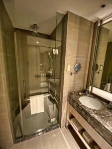 Linker Hand befanden sich Steckdosen für den Rasierer und ein unbeleuchteter Rasierspiegel. Warum es immer seltener Handtuchhalter in Hotels gibt verstehe ich nicht. Ich benutze weiterhin Handtücher und freue mich, wenn ich diese zum Trocknen in der Nähe des Waschbeckens aufhängen kann.