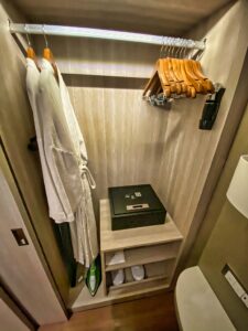 Im Kleiderschrank befanden sich der Safe, zwei Bademäntel in verschiedenen Größen und zwei Paare Hotelschlappen.
