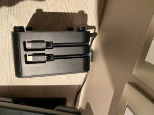 Im Zimmer war das Kingsize Bett zentral, rechts und links davon kleine Nachttische mit Schaltzentrale und einem Multiladegerät. Das war top und zeigt, dass das Hotel erkannt hat, das Reisene oft mit einer Menge Elektronik unterwegs sind. Gegenüber vom Bett war der in der Wand verbaute und schön große HD Fernseher angebracht.