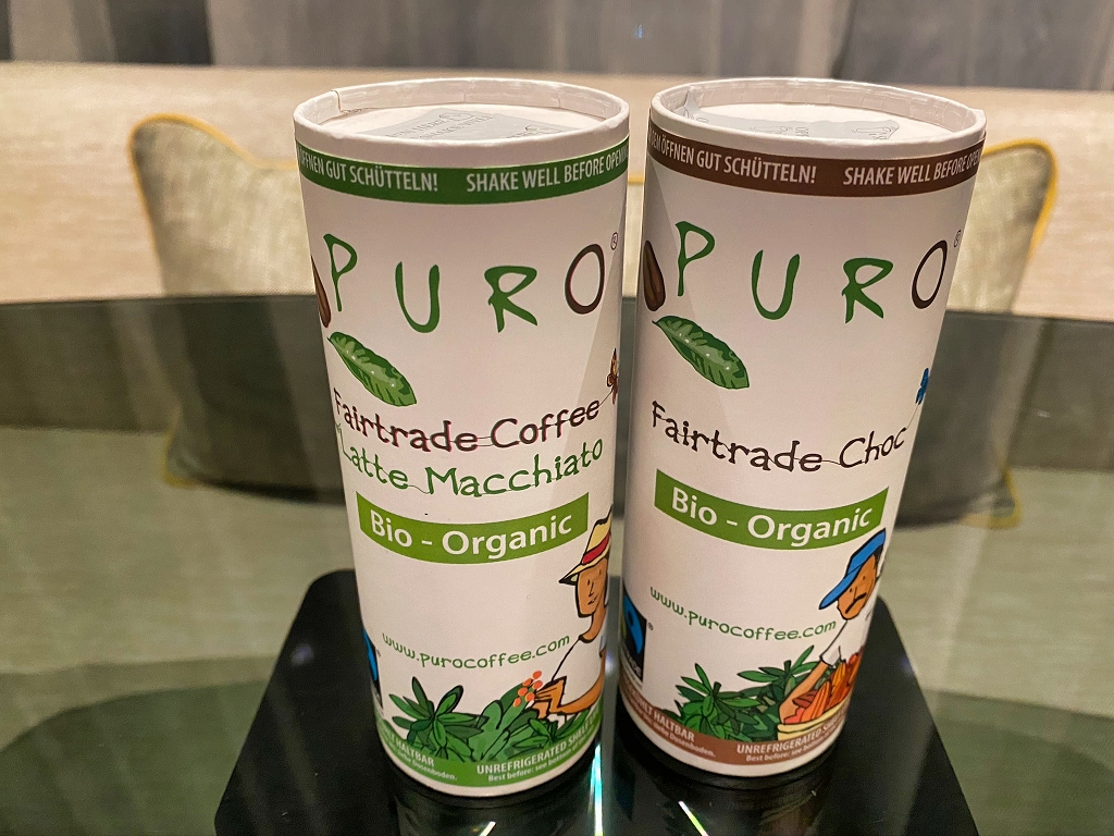 Zwischen Bett und Fenster stand noch ein Tisch. Auf dem lag ein Welcome Letter des Managements bereit und ein kleines Willkommensgeschenk. Das waren zwei „Pappdosen“ mit übersüßem Kaffee bzw. Kakao. Laut Auszeichnung wurden diese Bio-Produkte von einer Firma in Deutschland hergestellt oder vertrieben. Gesehen habe ich die Produkte hierzulande noch nie.