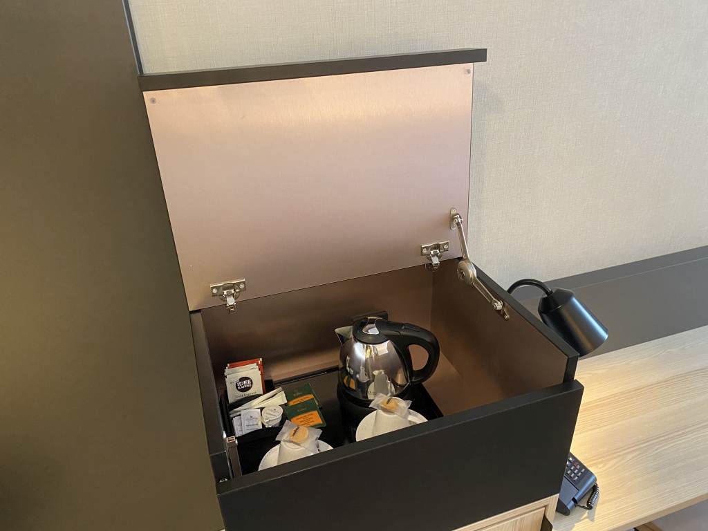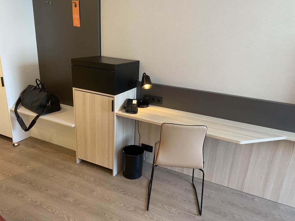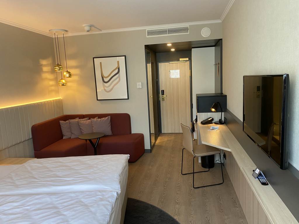 Das eigentliche Zimmer bestand aus einer kleinen roten Couch bestehend aus zwei Elementen und dem Kingsize-Bett. An der langen Wand gab es außerdem einen kleinen Garderobenschrank, der auch das Bügeleisen und Bügelbrett versteckte, einer kleinen Kofferablage, einem Schränkchen mit einem Kühlschrank und darüber einer Box mit Wasserkocher und Kaffee-/Tee. Daran schloss sich noch ein kleiner Schreibtisch mit Stuhl und der überschaubar große Flachbildfernseher an.