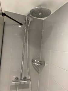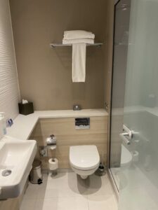 Da hatte ich nun ein modernes und scheinbar wirklich frisch renoviertes Premium-Zimmer. Etwas klein, aber ohne Teppich genau nach meinem Geschmack. Das Zimmer lag zur Straßenseite raus und begann mit einem kleine Flur, von dem es direkt in die Nasszelle ging. Für ein 4-Sterne-Hotel in Hamburg schon ein brutal kleines Badezimmer. Ausgestattet mit einem Waschtisch, einer Toilette und einer Walk-In-Shower mit Glasabtrennung. Optimal konstruiert, dass man mit einer Drehung alles im Bad erledigen konnte. Nun ja, außer trockene Füße zu behalten, wenn man zuvor duschen war.