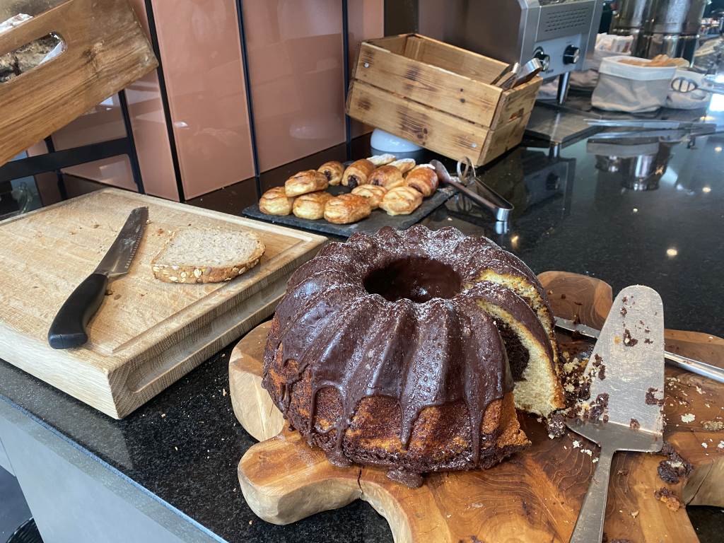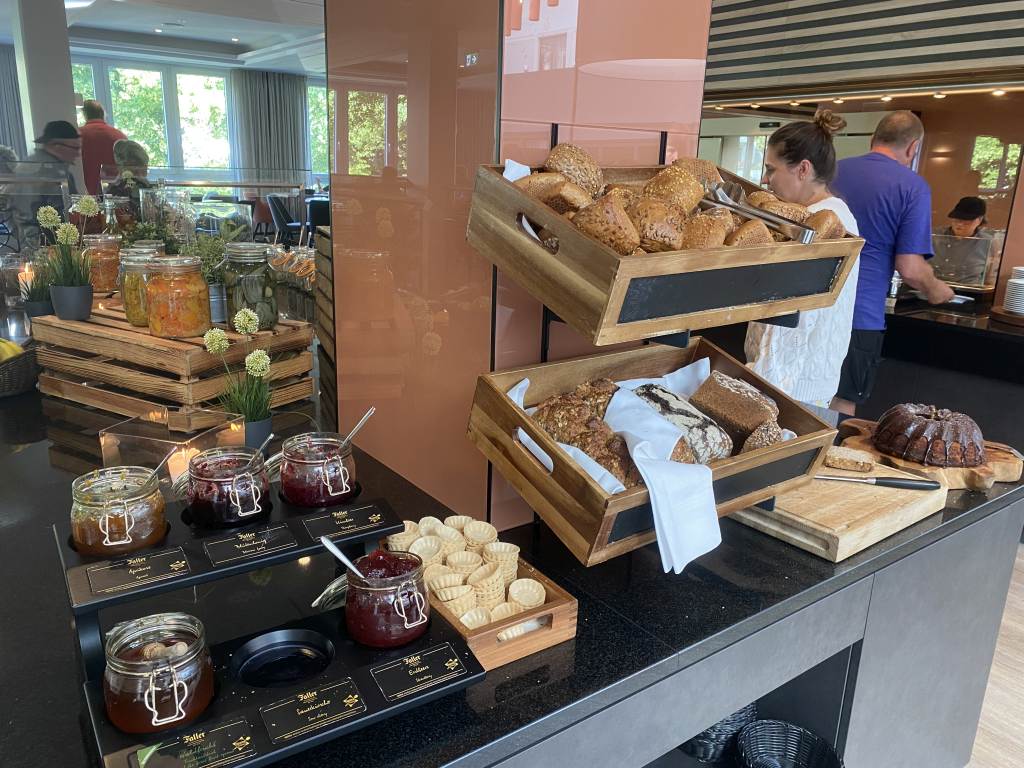 Das Frühstücksbüffet ist klein aber fein und hat eine ordentliche Qualität. Auf einer Ecke gibt es Backwaren, wie verschiedene Brötchen und Brote, Croissants und sogar Kuchen. Eine vegane Ecke besteht hauptsächlich aus Salaten, während daneben diverse Wurst und Käse-Sorten, sowie Rollmops präsentiert werden. Natürlich gibt es auch Honig, Marmeladen, Müsli und Joghurt.
