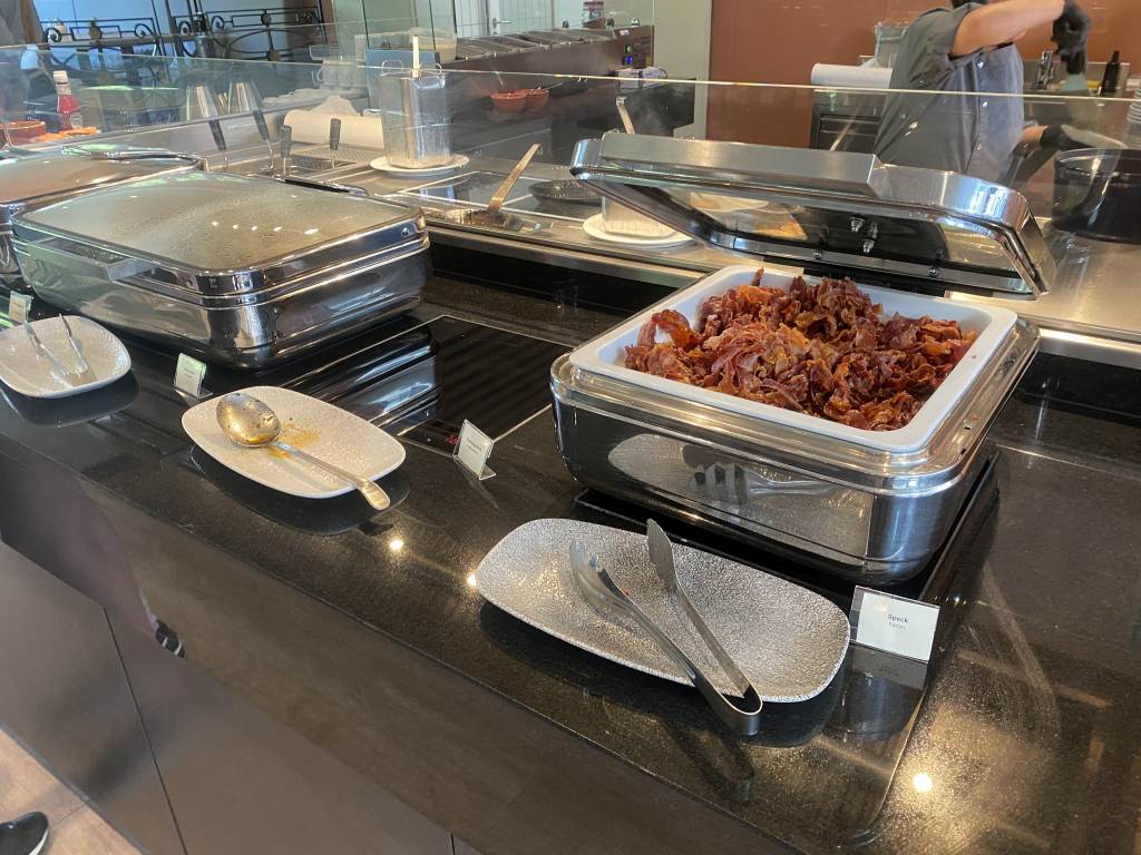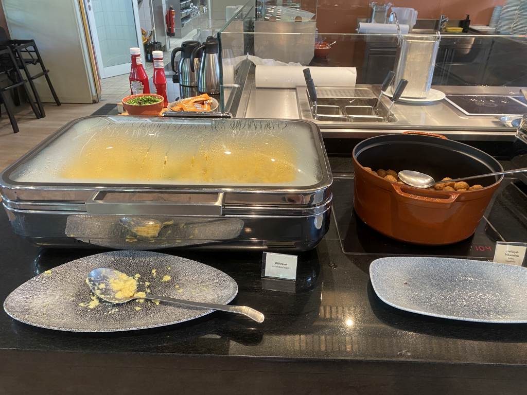 Als warme Speisen gab es unter anderem Rührei, Würstchen, Geflügelfrikadellen und Speck. Auf Wunsch wurden auch Spiegeleier, Omelette und Pancakes an der Livecooking-Station zubereitet.