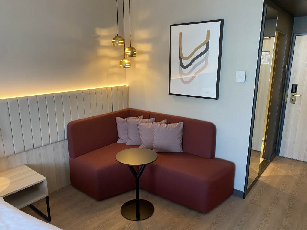 Das eigentliche Zimmer bestand aus einer kleinen roten Couch bestehend aus zwei Elementen und dem Kingsize-Bett. An der langen Wand gab es außerdem einen kleinen Garderobenschrank, der auch das Bügeleisen und Bügelbrett versteckte, einer kleinen Kofferablage, einem Schränkchen mit einem Kühlschrank und darüber einer Box mit Wasserkocher und Kaffee-/Tee. Daran schloss sich noch ein kleiner Schreibtisch mit Stuhl und der überschaubar große Flachbildfernseher an.
