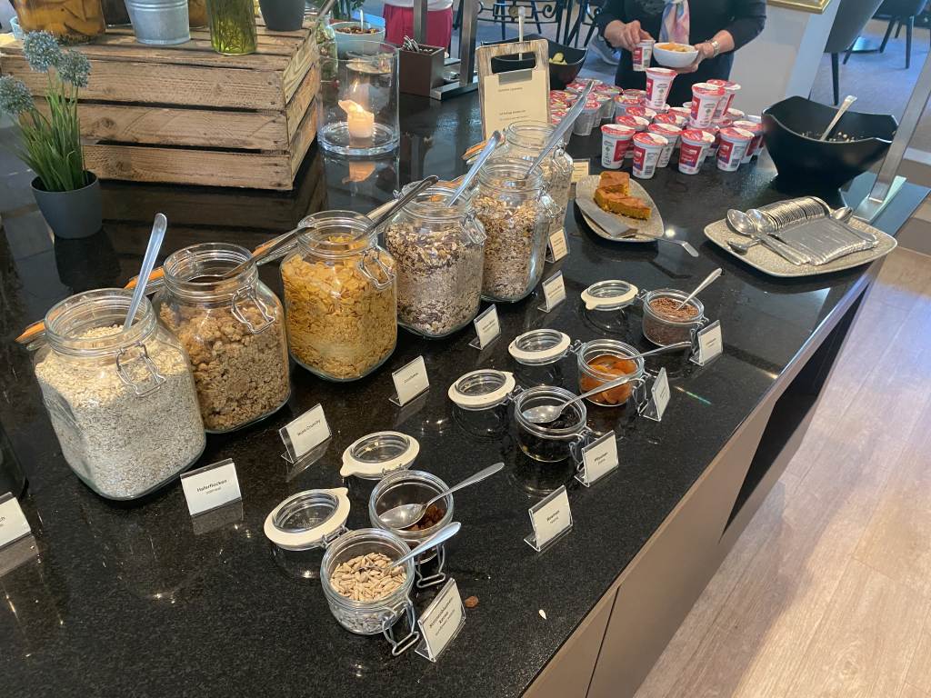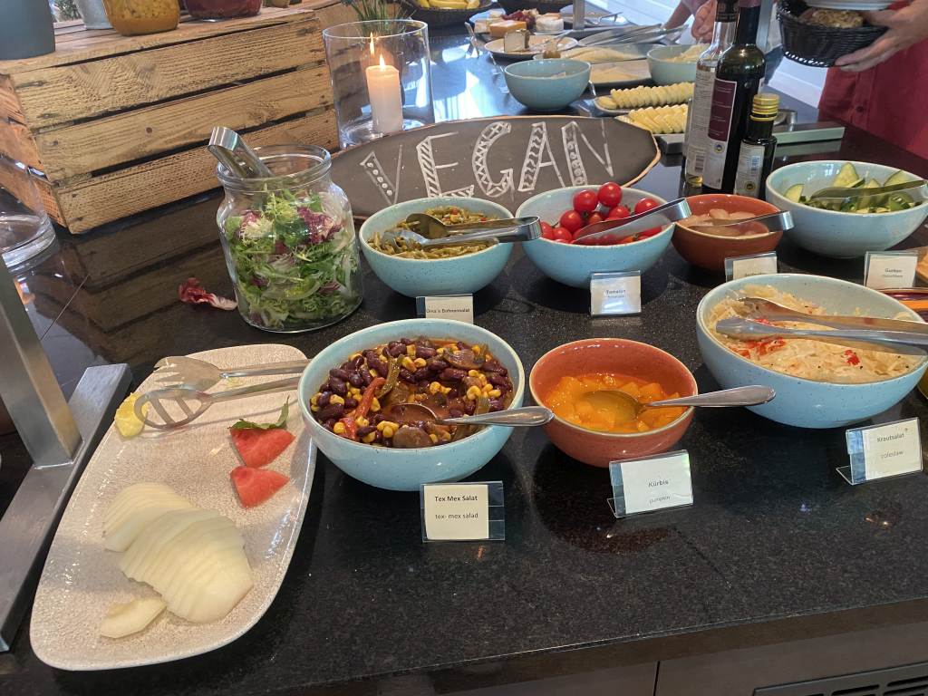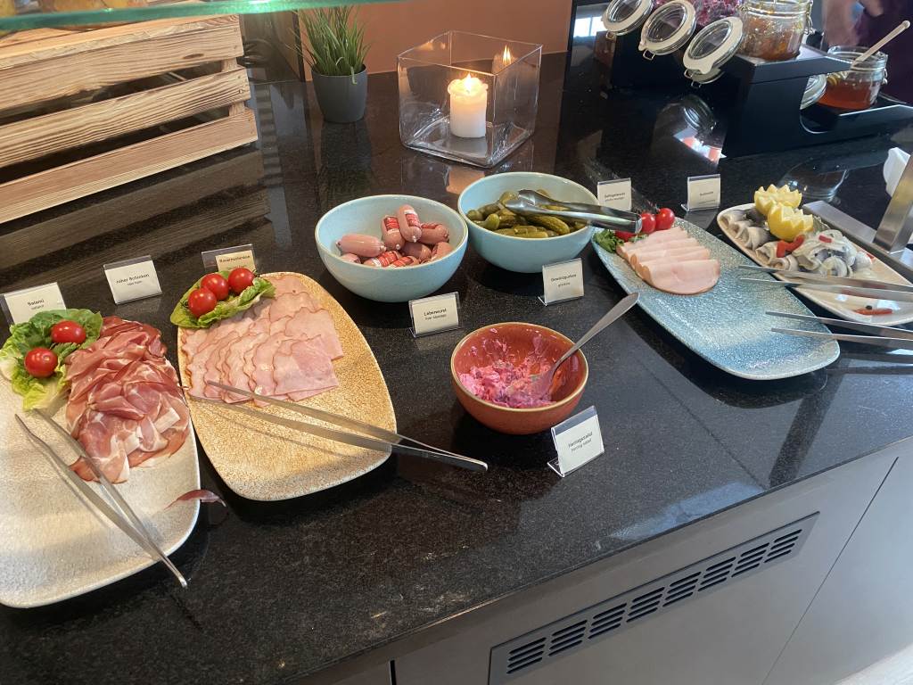 Das Frühstücksbüffet ist klein aber fein und hat eine ordentliche Qualität. Auf einer Ecke gibt es Backwaren, wie verschiedene Brötchen und Brote, Croissants und sogar Kuchen. Eine vegane Ecke besteht hauptsächlich aus Salaten, während daneben diverse Wurst und Käse-Sorten, sowie Rollmops präsentiert werden. Natürlich gibt es auch Honig, Marmeladen, Müsli und Joghurt.