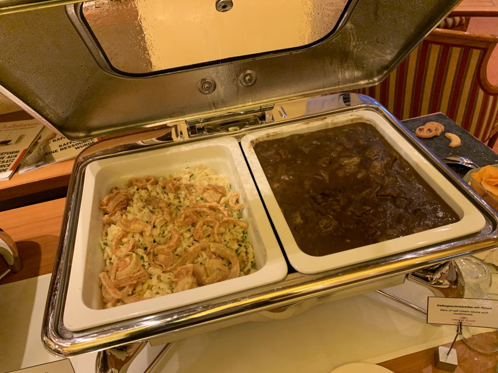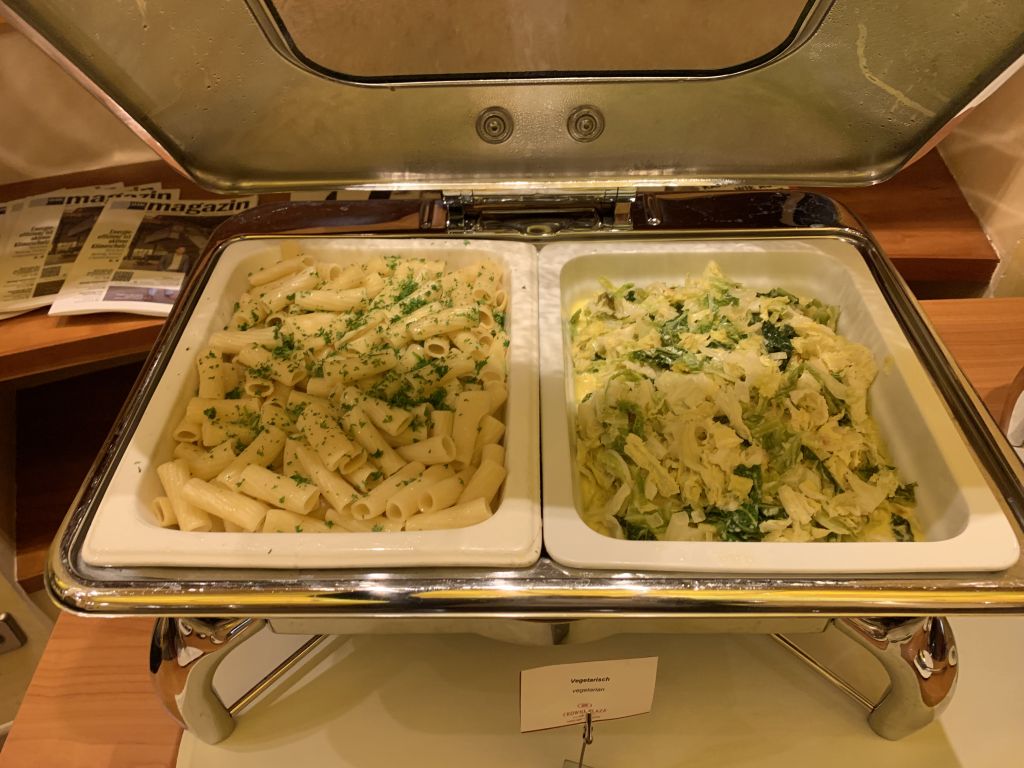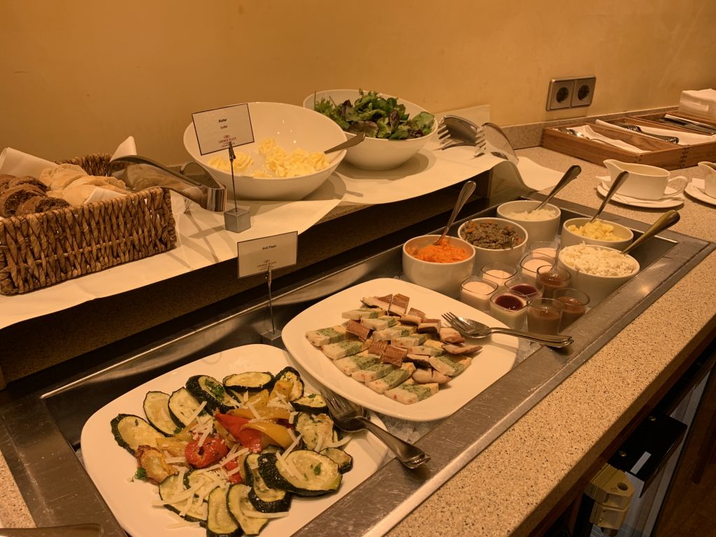 Die Auswahl beim Frühstück war völlig in Ordnung. Wer bei den warmen Optionen aus Würstchen, Frikadellen, Röstis und Champignons nicht fündig wurde, konnte noch auf Rührei, Speck und Bohnen ausweichen oder sich an der Live-Cooking-Station ein Omelette nach Wunsch zubereiten lassen. Ergänzt wurde das Frühstück um einige Wurst- und Käsesorten, Joghurts, Müsli und in etwa 20 Sorten Marmelade. Dazu gab es noch Lachs, Rollmops, Salat und Antipasti als Beilagen. Kaffee wurde uns aktiv am Tisch angeboten, konnten wir uns aber auch selbst an einem der Kaffeevollautomaten zubereiten.