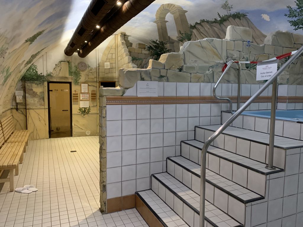 Es gibt dort einen großen Pool, sowie einen Whirlpool. Der Whirlpool war allerdings mit einer großen Platte bedeckt und scheint dauerhaft geschlossen zu sein. Geschlossen ist ein gutes Motto, denn auch im Sauna-Bereich wiesen an mehreren Stellen Absperrbänder darauf hin, dass Bereiche nicht zu benutzen sind. Dazu gehörte zum Beispiel auch das Eisbecken. Interessanterweise waren dies genau die gleichen Bereiche, die auch schon im April 2019 abgesperrt waren. Das ist leider eher eine Baustelle, als ein Wellness-Tempel.