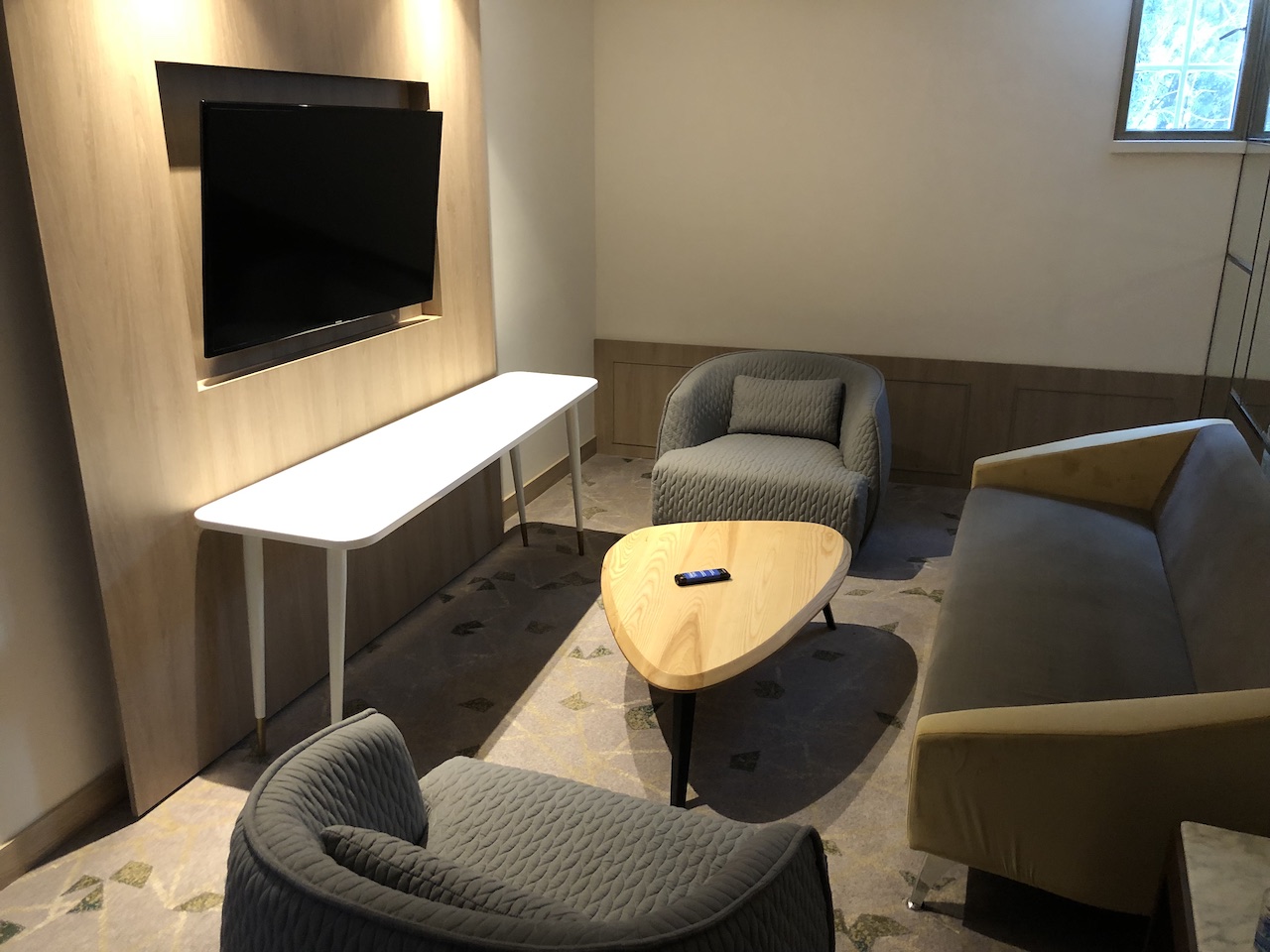 Unser Eckzimmer war über eine große Doppeltür zugänglich. Als erstes kommt eine Art Wohnzimmer mit Sesseln, Couch und Fernseher. Dieses war durch das kleine Fenster etwas dunkel.