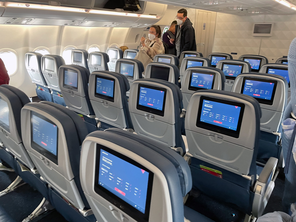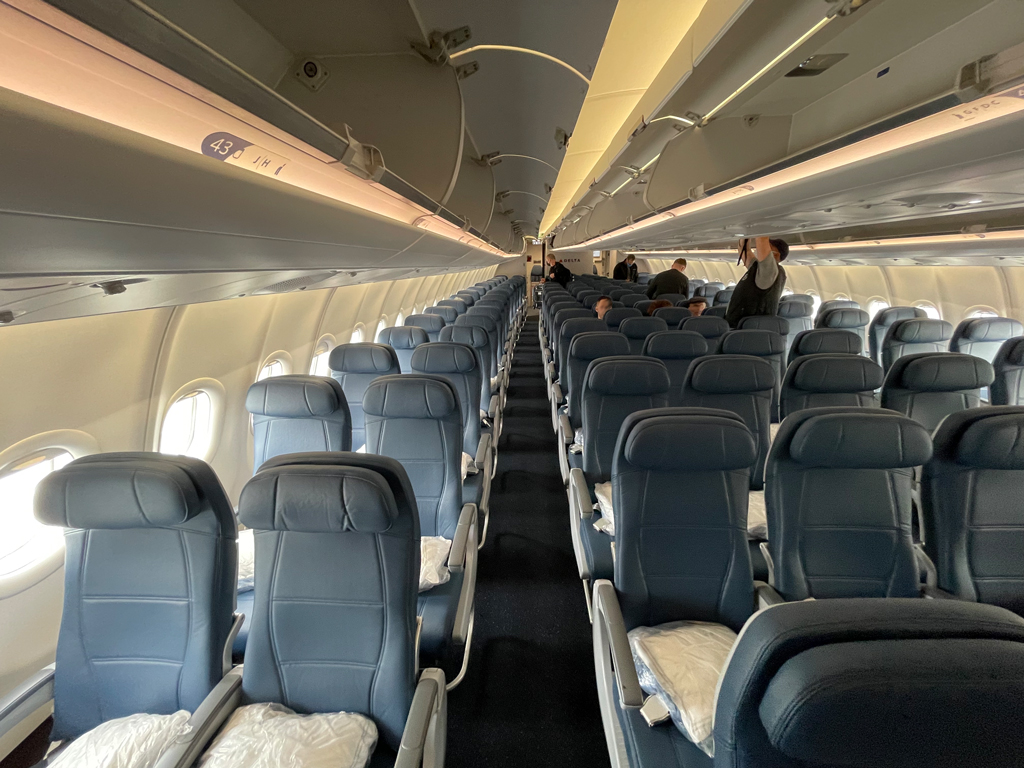 Die Sitze heißen aber nicht „Economy“, sondern Main Cabin. Das ist wichtig, denn die Economy Class – also Main Cabin – ist zwar das untere Ende der Fahnenstange, aber bei Delta geht es sogar unterirdisch weiter. Nach den Reisenden in der Main Cabin kommen noch die Reisenden in der „Basic Economy“. Die dürfen sich zwar auch auf die Main Cabin Sitze setzen, aber dürfen erst zusteigen, wenn alle Main Cabin Reisende an Bord sind. Sollten bis dahin alle Gepäckfächer voll sein, müssen Reisende der Basic Economy das Gepäck unter dem Vordersitz verstauen. Der Lohn für die Entbehrungen: gering, denn Meilen sammeln diese Reisenden nicht.