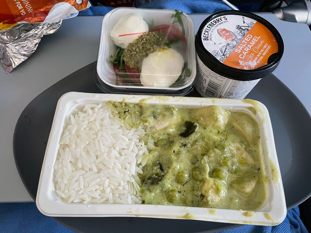 Circa 45 Minuten nach dem Start am Mittag begann der Service. Eine Ansage brachte den Passagieren die Essensoptionen näher (Chicken or Pasta). Bei den Getränken steht die „Full Bar“ zur Verfügung, d.h. dass auch alkoholische Getränke gratis ausgegeben werden. Allerdings wurde die Getränke erst zehn Minuten nach der Essensausgabe verteilt. Weitere 25 Minuten später gab es dann eine zweite Getränkerunde.