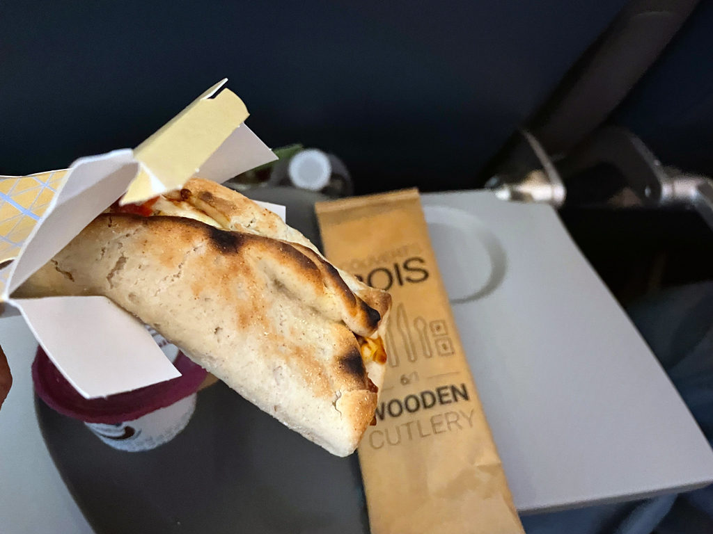 Eine dreiviertel Stunde vor der Landung in New York gab es noch einen Snack. Dieser bestand aus einer Pizza und einem Mousse. Dazu gab es auch noch einmal Getränke. Die Pizza schmeckte ganz ok, ohne die Packung hätte ich allerdings nicht sagen können, wonach.