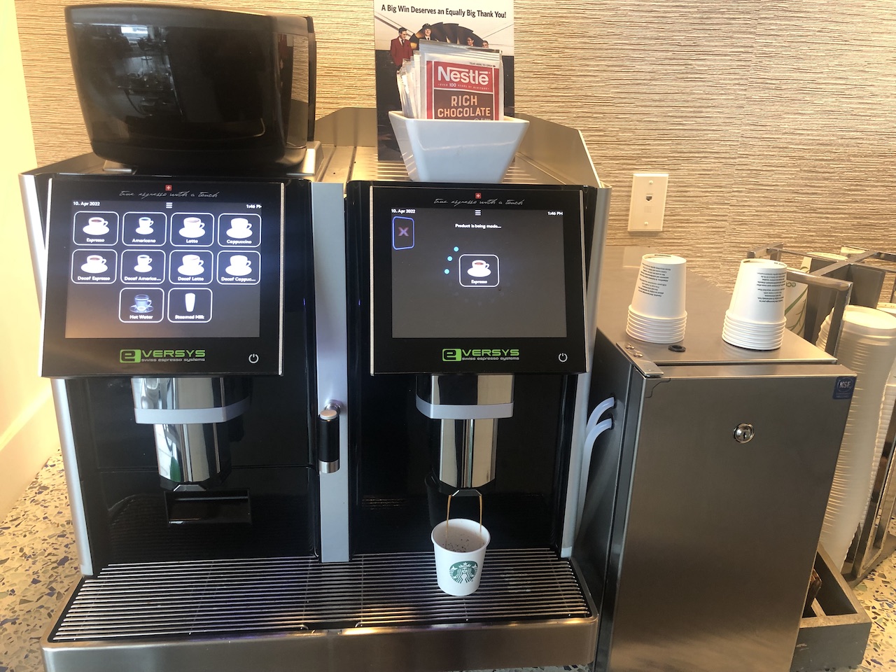 An mehreren Stellen der Lounge stehen Wasser, Kaffee und Tee sowie Obst oder Riegel und Snacks bereit. Desserts sind zusätzlich neben dem Buffet erhältlich.