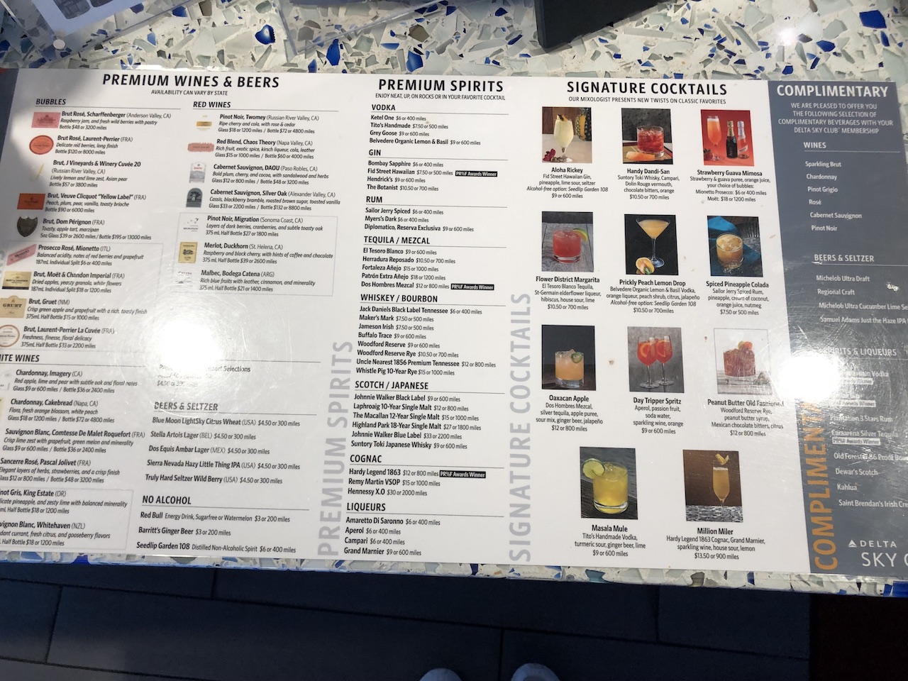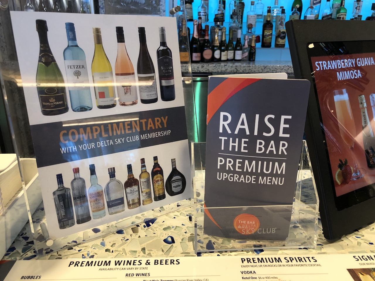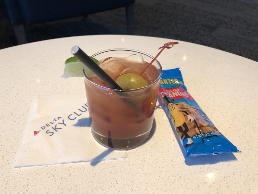 Alkoholische Getränke werden an der Bar bestellt, dort bereiten die Mitarbeiter auch diverse Cocktails zu. Die Premium-Drinks werden ebenfalls an der Bar bestellt, zur Bezahlung akzeptiert man auch Skymiles- die Meilenwährung bei Delta. Der Kurs ist ungewöhnlich gut, manche sehen dies sogar als Sweetspot. Insbesondere der Champagner von Dom Perignon fällt hier besonders auf, kostet eine Flasche um die 200$- die man mit 14.000 Meilen begleichen kann. Einlösungen für ein einzelnes Glas oder die halbe Fische sind ebenfalls möglich.