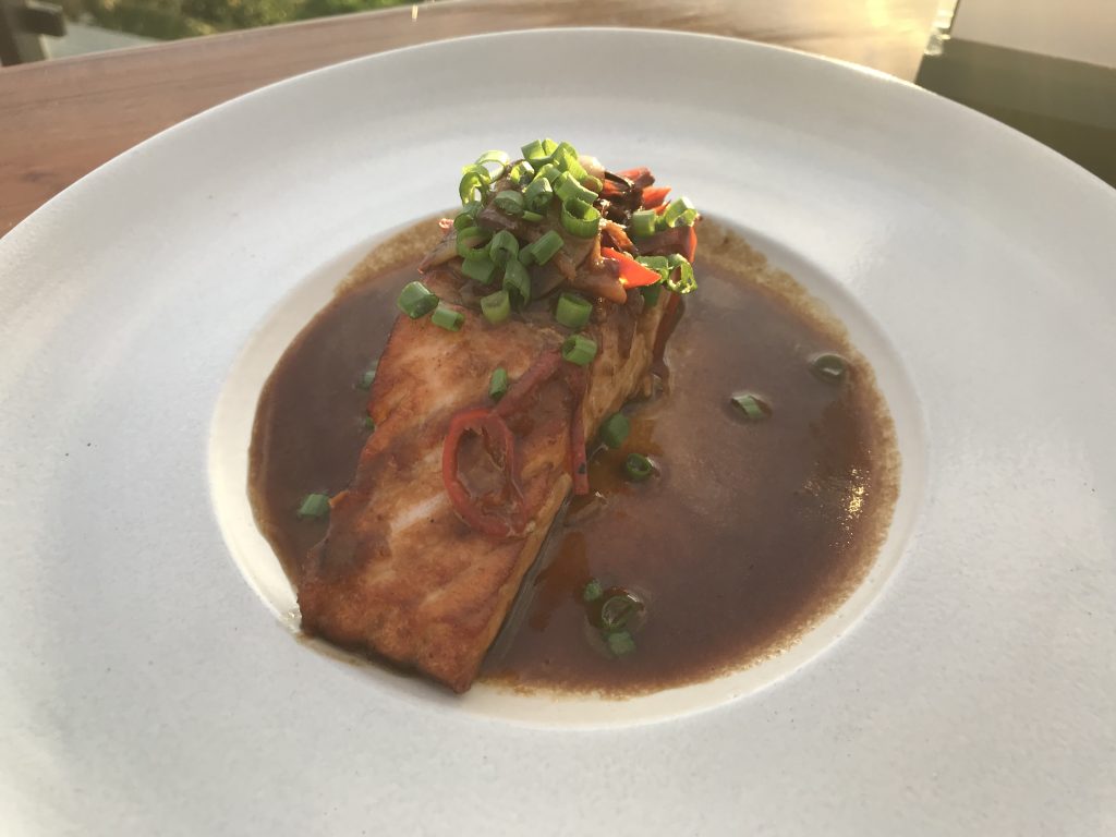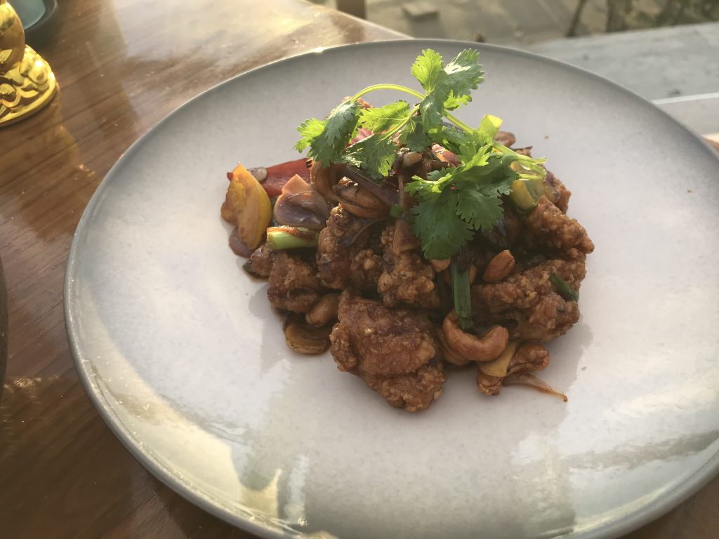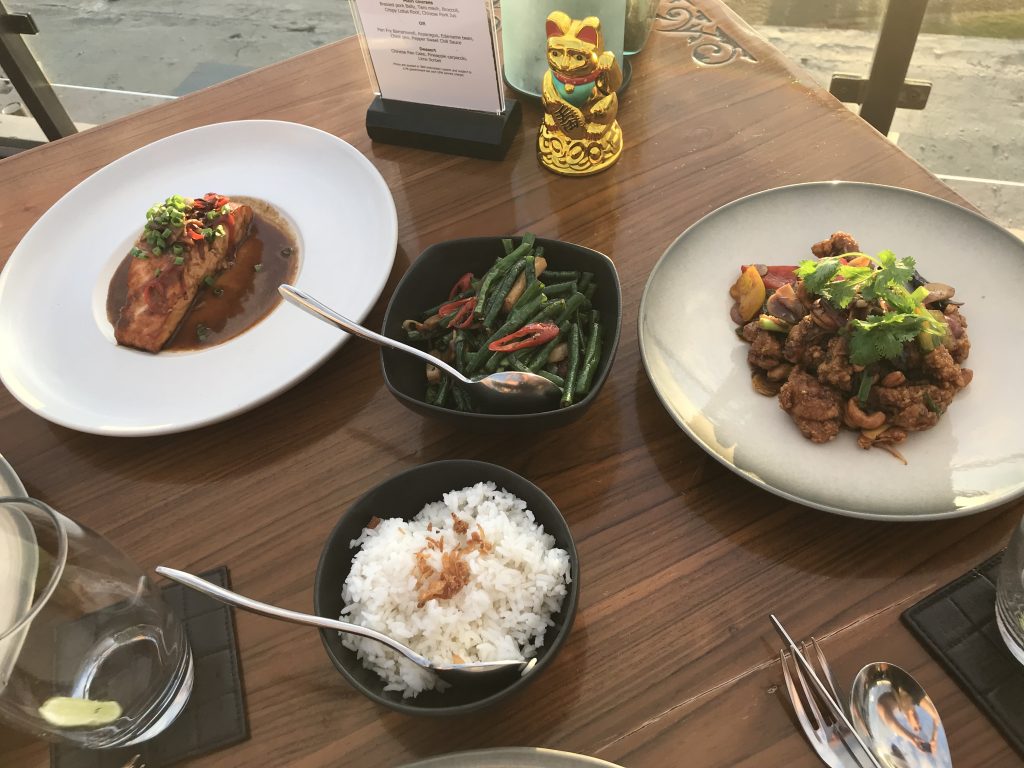 Zuerst haben wir uns Lachs und ein Cashew-Hähnchen bestellt. Im MoonLite sind alle Speisen zum Teilen ausgelegt. Das heißt, alles wird auf separaten Tellern serviert und jeder Gast bekommt noch einen eigenen leeren Teller.