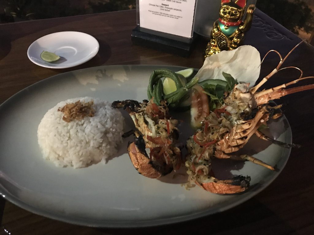 Christoph hat sich einen kleinen Hummer ausgesucht, der in seinem Beisein „geangelt“ wurde. Wir sind anschließend an unseren Platz zurückgekehrt und haben die Aussicht genossen, bis das fertige Hummergericht kam.