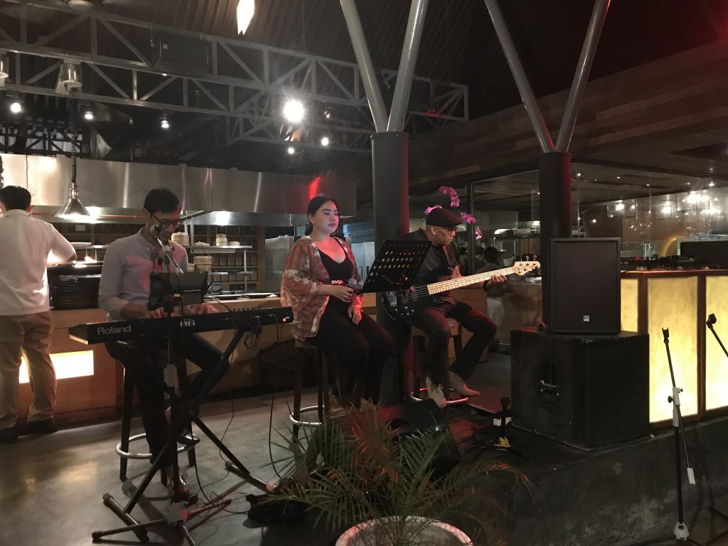 Nach dem Sonnenuntergang wurde zu Live-Musik gewechselt. Die Qualität der dargebotenen Stücke war gut und die Lautstärke angemessen. Die Live Musik, das gute Essen und der pinkfarbene Himmel haben eine romantische Atmosphäre verbreitet.