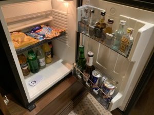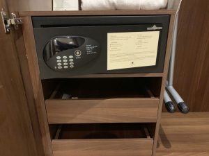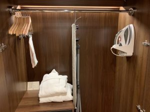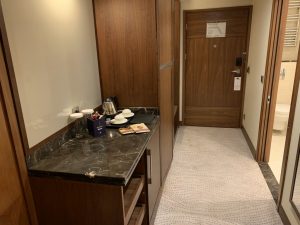 Beim Betreten des Zimmers standen wir zunächst in einem Flur mit einem Schrank an der rechten Wand. Im Schrank fanden wir auch den Safe, unsere Bademäntel sowie Bügelbrett und Bügeleisen. Hinter dem Kleiderschrank stand ein Sideboard mit integrierter Minibar, welche mit ein paar Snacks, Softdrinks, Bier und Spirituosen gefüllt war. Auf dem Sideboard stand ein Wasserkocher mit Instant-Kaffee-Päckchen bereit.