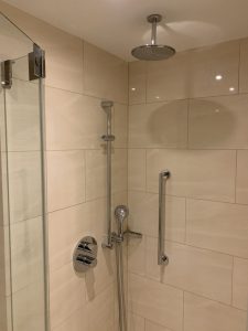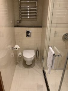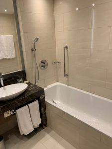 Die Tür zum Bad befand sich entsprechend auf der linken Seite des Flurs. Das Badezimmer selbst war recht groß und hatte sowohl eine große Badewanne als auch eine separate Dusche. In der Dusche fanden wir eine Handbrause als auch einen Duschkopf an der Decke. Die Amenities waren, wie gewohnt, von Crabtree & Evelyn.
