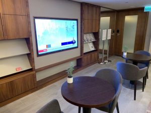 Zur Ausstattung dieses Teils der Lounge gehört ein Fernseher, ein Regal mit Zeitschriften und ein PC-Arbeitsplatz, wobei ich bei unserem Besuch unsicher war, ob dieser frei zugänglich ist oder für Mitarbeiter gedacht ist. Das Büffet wird ebenfalls in diesem Teil der Lounge aufgebaut.