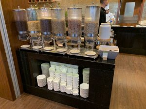 An der Rezeption wurden wir freundlich begrüßt und kurz geprüft, ob wir Zugang zum Frühstück haben. Unsere Plätze durften wir uns dann selbst suchen. Direkt im vorderen Bereich des Frühstücks-Restaurant gibt es allerdings einen durch Kordeln abgetrennten Bereich für Hilton Honors Member unabhängig vom Status. Dort fanden wir auch schnell einen freien Tisch.