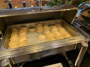 Am Frühstücks-Büffet ist definitiv für jeden Geschmack etwas dabei. Eierspeisen wurden uns an der Live-Cooking-Station zubereitet. Alternativ konnten wir auf die fertig vorbereiteten Rühreier und gekochten Eier zurückgreifen. Dazu könnt gibt es auch noch weitere warme Speisen in der Selbstbedienung. Dazu gehören herzhafte Gerichte, wie zum Beispiel polnische Würstchen oder warme Süßspeisen, wie Waffeln, Pirogi oder Brownies.