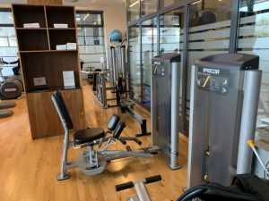 In der untersten Etage findet sich ein großer Fitness-Raum, der alles zu bieten hat, was man so benötigt. Die Cardio-Geräte der Firma Precor sind gleich mehrfach vorhanden, so dass man hier in der Regel mindestens ein freies Laufband oder einen Stepper vorfindet. Dazu gibt es alle möglichen Geräte für Krafttraining plus Hanteln, Gymnastik-Bälle und so weiter. Alles machte eine top gepflegten Eindruck.
