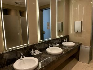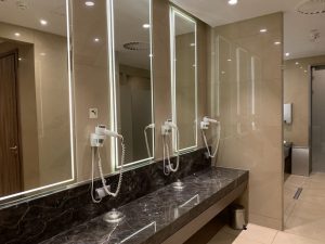 Toiletten befinden sich außerhalb der Lounge direkt neben dem Fahrstuhl.