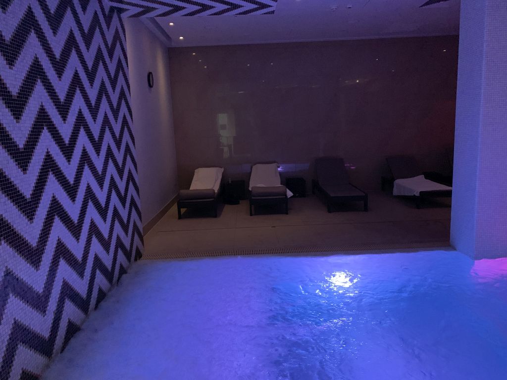 Die „Level-up Zone“ besteht aus zwei Räumen. In dem größeren Teil des Wellness-Bereichs findet sich ein Whirlpool, der in unterschiedlichen Farben beleuchtet wird. Außerdem fanden wir dort eine Sauna, das Dampfbad und einige Duschen inklusive Eis-Schale. Für Erfrischungen ist ebenfalls gesorgt, da direkt neben der Zugangstür ein Wasserspender sowie Obst bereit stehen.