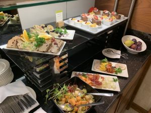 Unseren zweiten Besuch statteten wir der Executive Lounge während der Cocktail Hour ab. Die Auswahl an alkoholischen Getränken konnte dabei weniger Punkten. Es gab an Spirituosen lediglich einen Grant’s Whiskey, Finsbury Gin, Campari und polnischen Wodka (immerhin auf Eis!). Auch wenn es sowohl Weißwein wie auch Rotwein gab, waren die geschmacklich ebenfalls keine Offenbarung. Bier wurde leider nur in einem Kühler mit wenig Eis halbherzig nachgefüllt.