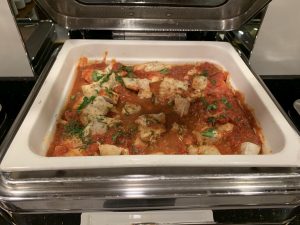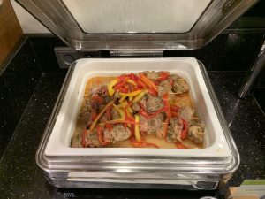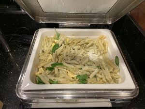 Die Auswahl an Speisen war dafür deutlich besser. So gab es kalte Snacks, wie Schinken mit Honigmelone, Wurst, Pastete und Wraps. Dazu wurden diverse leckere Salate serviert. Sogar drei Warme Gerichte, wie zum Beispiel Schaschlik und Penne, wurden aufgefahren. Diese Gerichte waren sogar wirklich gut im Vergleich zu anderen Lounge-Erlebnissen.