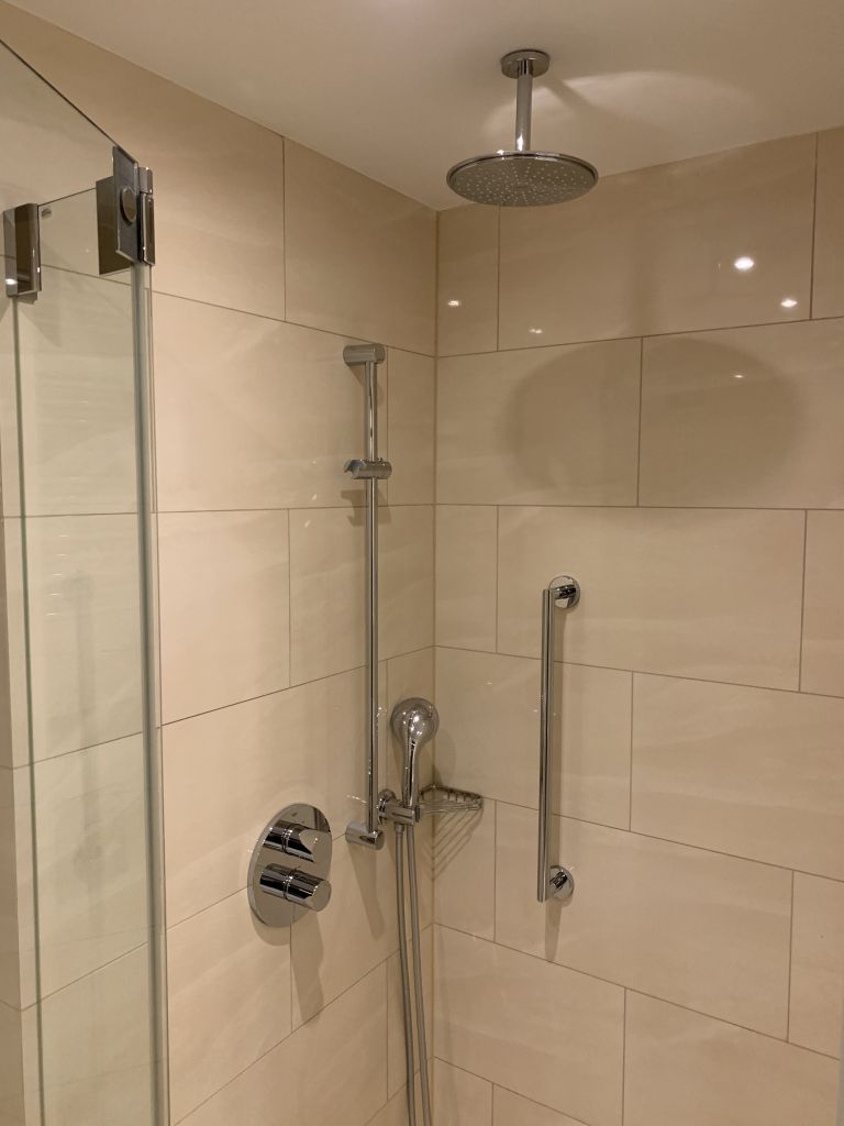 Die Tür zum Bad befand sich entsprechend auf der linken Seite des Flurs. Das Badezimmer selbst war recht groß und hatte sowohl eine große Badewanne als auch eine separate Dusche. In der Dusche fanden wir eine Handbrause als auch einen Duschkopf an der Decke. Die Amenities waren, wie gewohnt, von Crabtree & Evelyn.