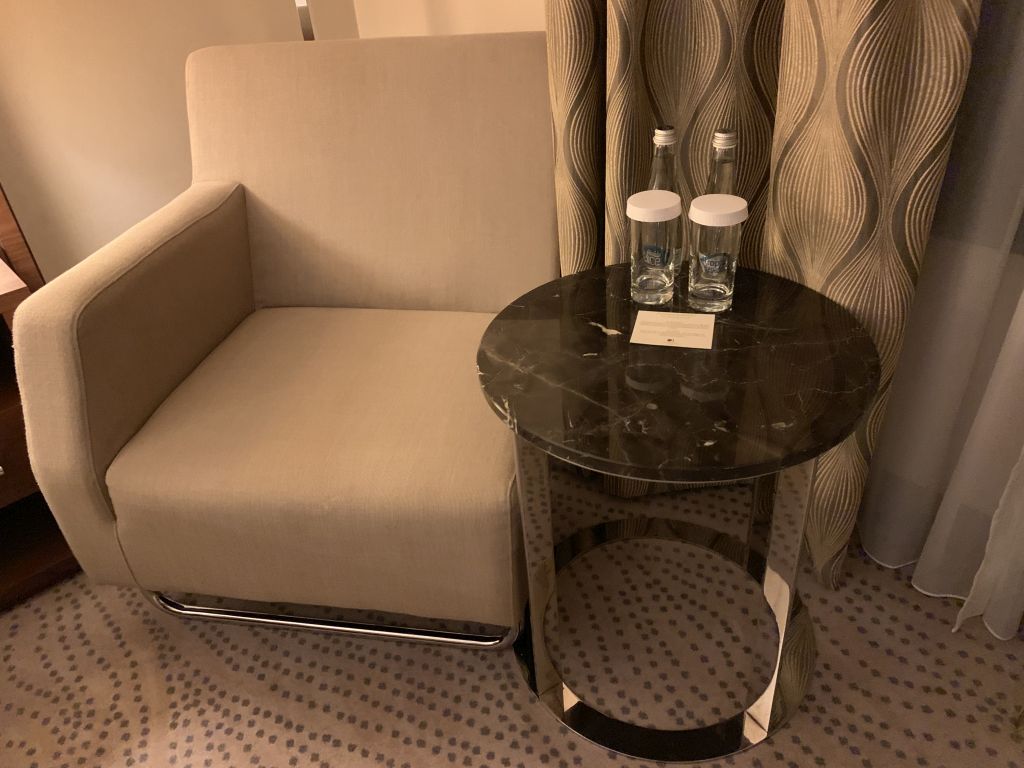Direkt gegenüber vom Bett hing ein großer Flachbildfernseher an der Wand. Wer nicht vom Bett aus fernsehen will, kann dies auch von einem einzelnen Sessel tun, neben dem auch ein kleiner Tisch stand. Zur Begrüßung warteten auf diesem Tisch auch zwei Flaschen kostenloses Wasser. Links neben dem Fernseher verfügt das Executive Zimmer noch über einen Schreibtisch mit Drehstuhl, der wegen des großen Spiegels auch als Schminktisch genutzt werden kann.