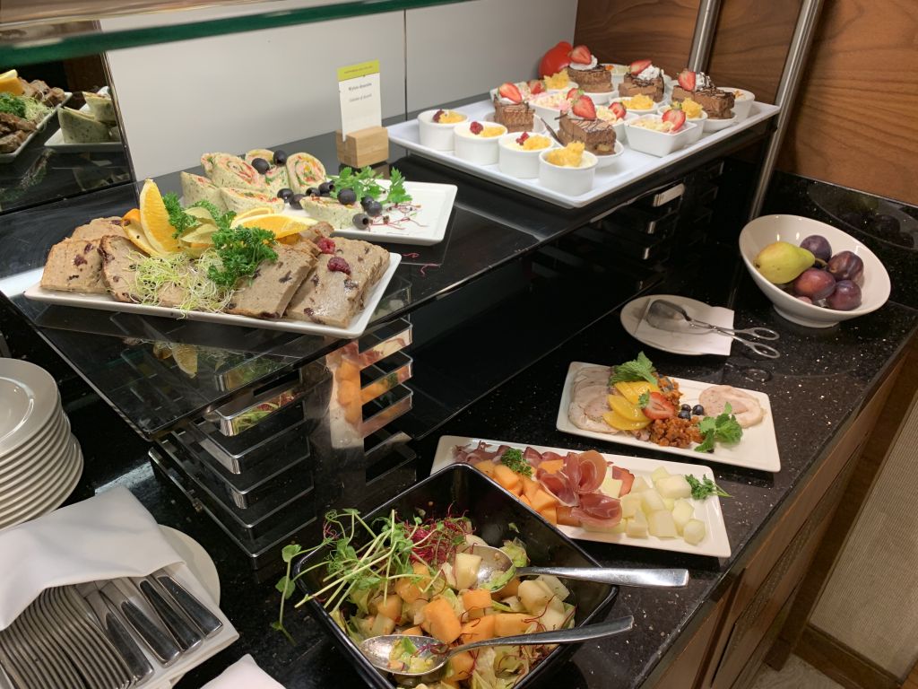Die Auswahl an Speisen war dafür deutlich besser. So gab es kalte Snacks, wie Schinken mit Honigmelone, Wurst, Pastete und Wraps. Dazu wurden diverse leckere Salate serviert. Sogar drei Warme Gerichte, wie zum Beispiel Schaschlik und Penne, wurden aufgefahren. Diese Gerichte waren sogar wirklich gut im Vergleich zu anderen Lounge-Erlebnissen.