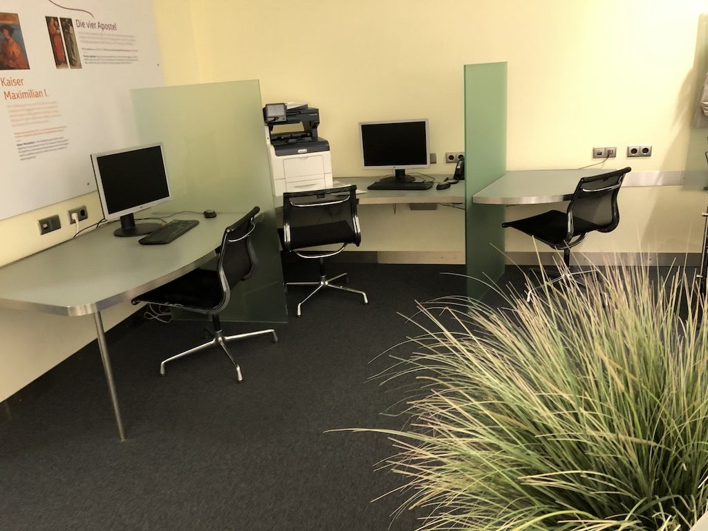 Es gibt ein Angebot an Zeitschriften und aktuellen Tageszeitungen in Regalen an der Wand. In einer Ecke sind zwei Computer mit Drucker installiert. Mit dem eigenen Laptop lässt es sich an einem Tresen am Besten arbeiten, Stromanschlüsse gibt es überall.