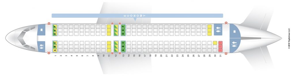 Wie auf der Seatmap (Quelle: seatguru.com) erkennbar ist, sind natürlich klassischerweise befinden sich in den Notausgangsreihen im Airbus A320 die attraktivsten Sitzplätze.