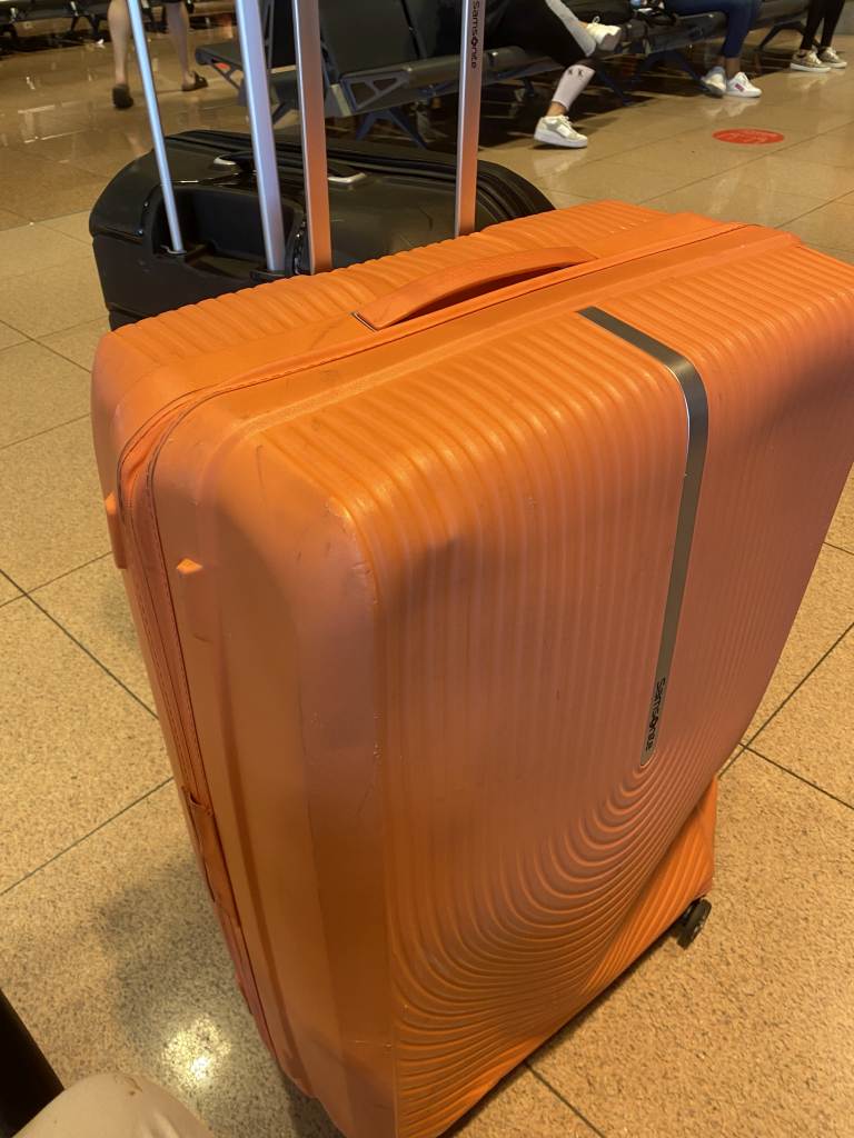Eine kleine Überraschung erwartete uns dann noch bei der Ankunft in Hamburg. Zum einen wurde das letzte Teil unserer Kinderwagen erst lang lang nach dem letzten Gepäckstück des letzten Passagiers an der Sperrgepäckausgabe herausgegeben. Zum anderen sah der Koffer meiner Frau so aus…