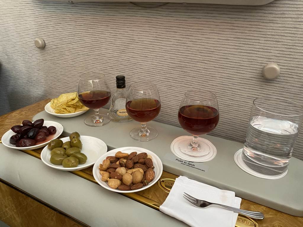 Was viele wissen, ist dass Emirates mit dem Hennessy Paradis einen Cognac an Bord hat, der selten für unter 1000 Euro pro Flasche im Handel zu erwerben ist. Was aber viele nicht wissen, dass auch die zweite Wahl, der Tesseron Lot 29 Cognac mal eben mehr als schlappe 400 Euro auf der Kreditkarte verbucht. Beides damit die teuersten Getränke, die ich in meinem Leben hatte.