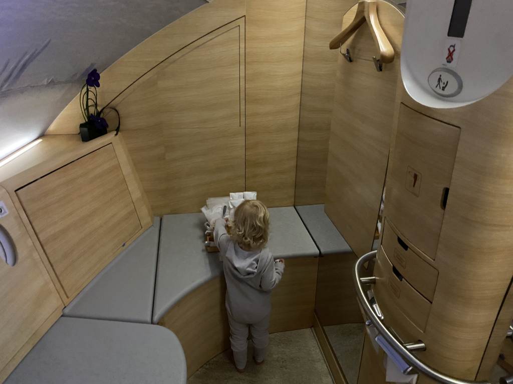 Aber ähnlich wie auf unserem Singapore Airlines Flug nach Dubai fühlte sich alles ein bisschen besser an. Noch ein bisschen besser sogar, denn so eine eigene Suite, die man einfach mal abschließen kann, macht das Leben schon einfacher. Und irgendwie war mit all den Giveaways, wie dem Kinderdecken und dem Kreativset sowie der Fotosession mit der Sofortbildkamera einfach mehr los, was eine entspannte Atmosphäre während des Boardings und Abflugs schaffte.
