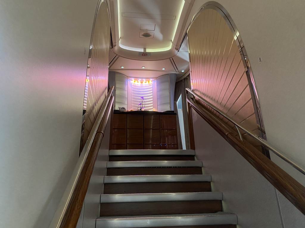 Es war nicht viel mehr als noch eine Stunde vor der Ankunft in Hamburg. Ich spazierte mit Larissa nochmals etwas durch die Kabine. Dieses Mal hielten wir uns im vorderen Bereich der First Class auf. Die Treppen nach unten waren total spannend, aber auch die Türen zu den Lavatories und Shower Spas.