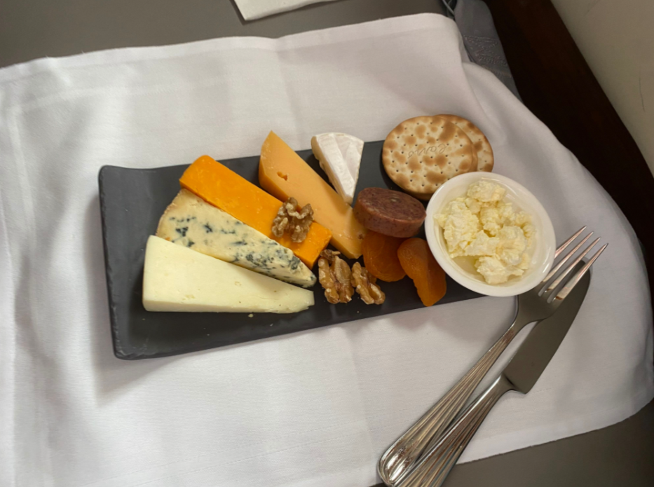 Plötzlich fehlten allerdings meine Frau und das andere Kind. Beide fand ich nach kurzer Suche hinten an der Bar, wo sich meine Frau mit der Crew unterhielt. Ich hatte dabei total meine Käseplatte vergessen und war umso überraschter, dass mir die plötzlich am anderen Ende des Flugzeugs in der Bar serviert wurde.