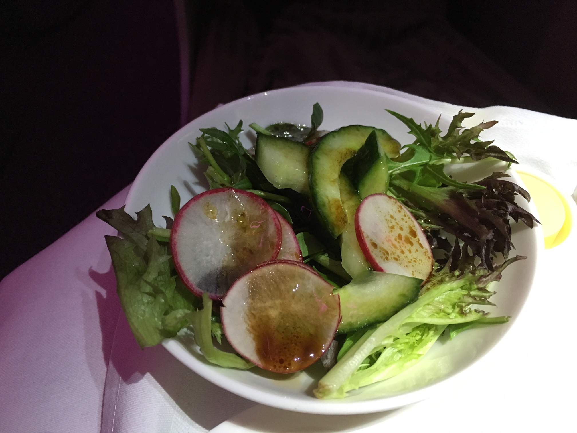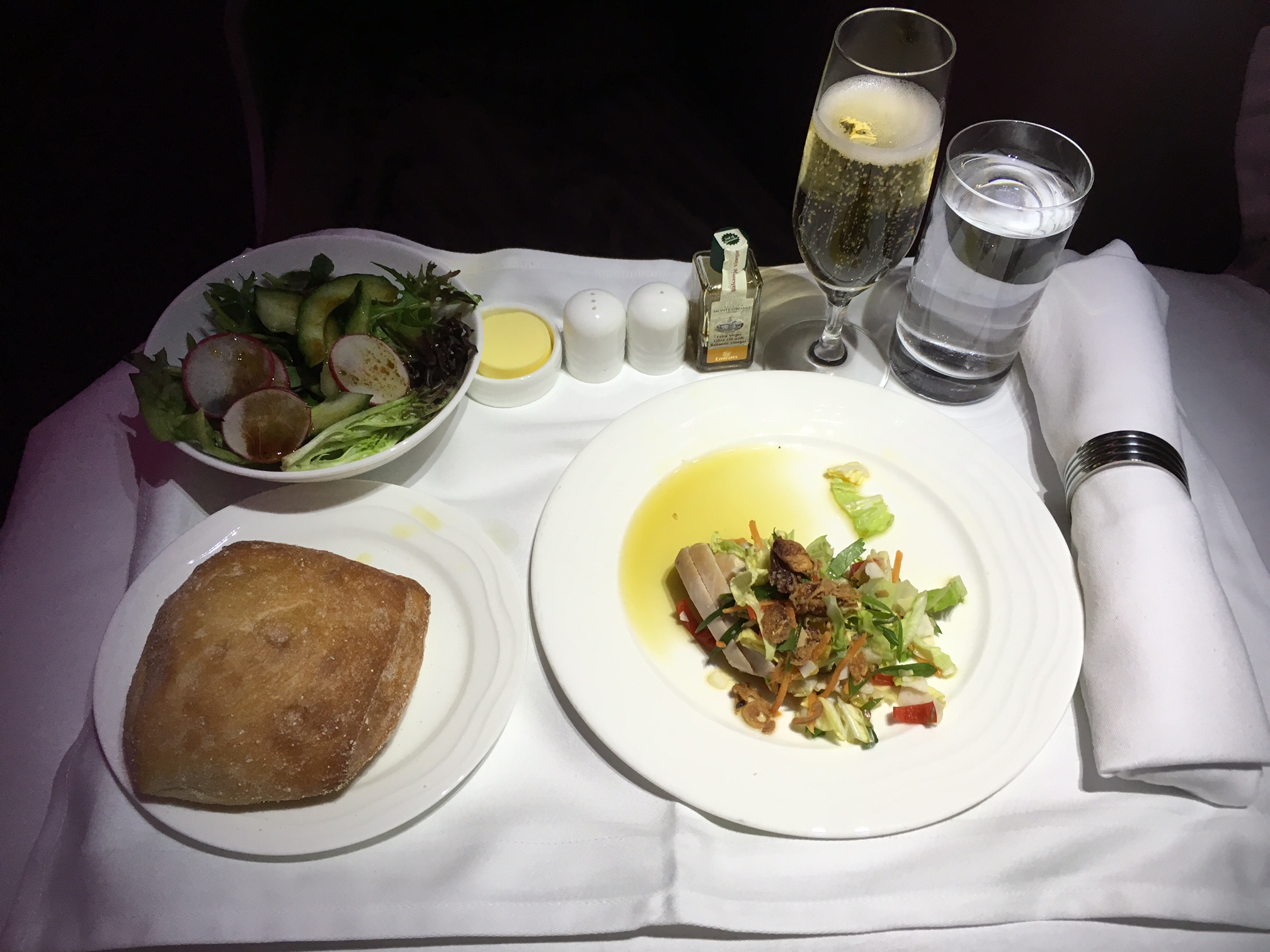 Die Vorspeise wird in der Emirates Business Class auf einem Tablet zusammen mit einem Salat und dem Brotteller serviert. Auch wenn ich die Präsentation der Vorspeise durchaus gut finde, bin ich kein Fan von Tablets in der First- oder Business Class. Mein asiatisches Huhn mit Mango- Chili Marinade war gut, wenn auch nicht spektakulär.