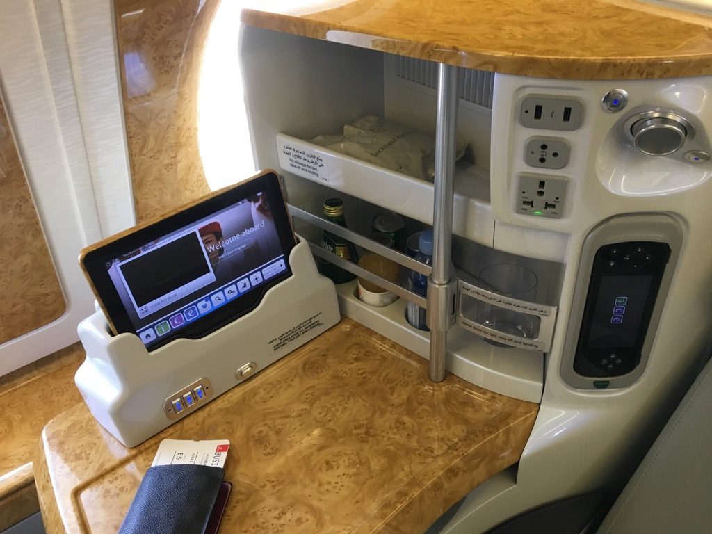 In der Seitenkonsole ist neben der Minibar auch das Tablet untergebracht, mit welchem man den Sitz und das Entertainmentsystem bedienen kann. Auch ein 110 Volt Anschluss, zwei USB Anschlüsse und die Kopfhöreranschlüsse findet man hier.