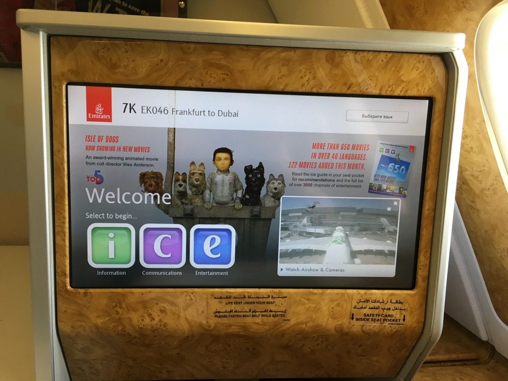 Das ICE Entertainmentsystem von Emirates gehört zu den umfangreichsten der Welt und bietet tausende von Stunden an Filmen, Serien und Musik. Ich muss allerdings gestehen, dass ich es nicht genutzt habe, allerdings wird einem auch auf sehr langen Flügen sicher nicht langweilig.