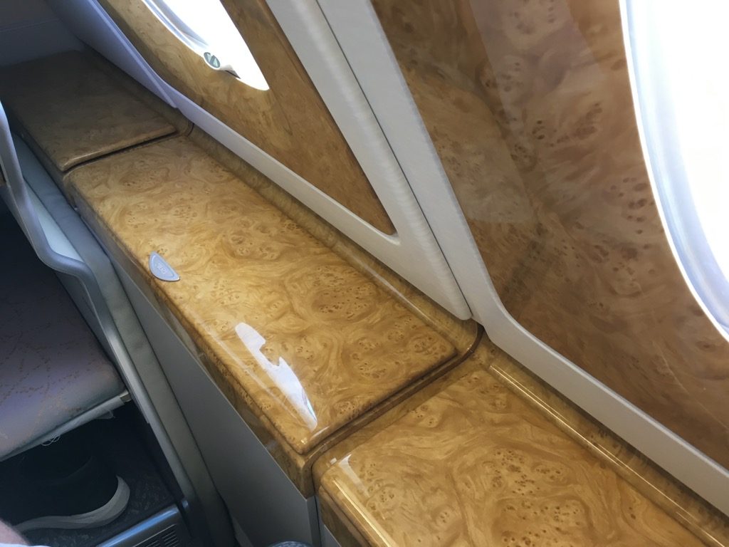 Die gesamte Emirates Business Class Kabine wirkt durch ihr Design mit viel Wurzelholz und Gold wie ein Traum aus 1001 Nacht. Über Geschmack kann man allerdings vortrefflich streiten und daher will ich dies nicht bewerten.