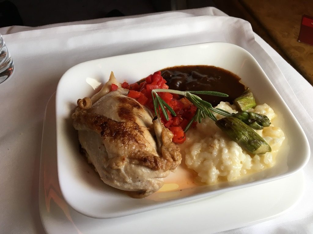 Das Huhn zur Hauptspeise war gut und für Flugzeugessen sogar sehr gut, allerdings hat es mich auch nicht wirklich vom Hocker gehauen. Irgendwie würde ich mir wünschen, dass Emirates die Hauptspeisen in der Business Class wieder individuell anrichtet.
