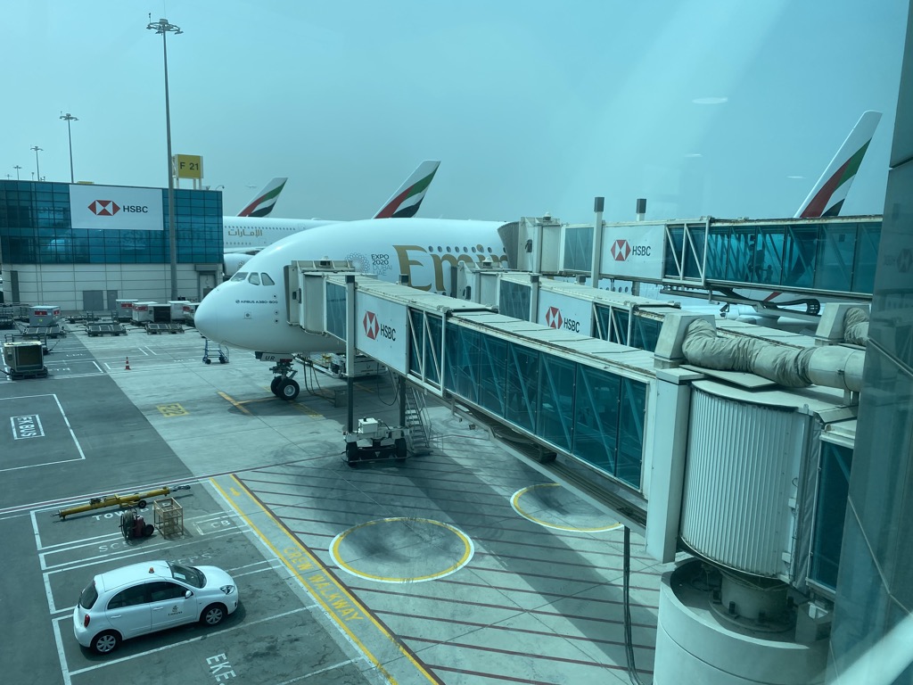 Nachdem das Boarding bei unserem letzten Flug ab Dubai einfach nur anstrengend war, da am Gate nochmal von allen Gästen mehr oder weniger unkoordiniert alle Dokumente geprüft wurden, konnten wir diesmal das Gate komplett umgehen. Von der Emirates First Class Lounge aus, kann man einige Gates direkt vom oberen Lounge-Stockwerk aus boarden. Hier werden zwar auch die Dokumente geprüft, aber der Andrang an Gästen war deutlich geringer.