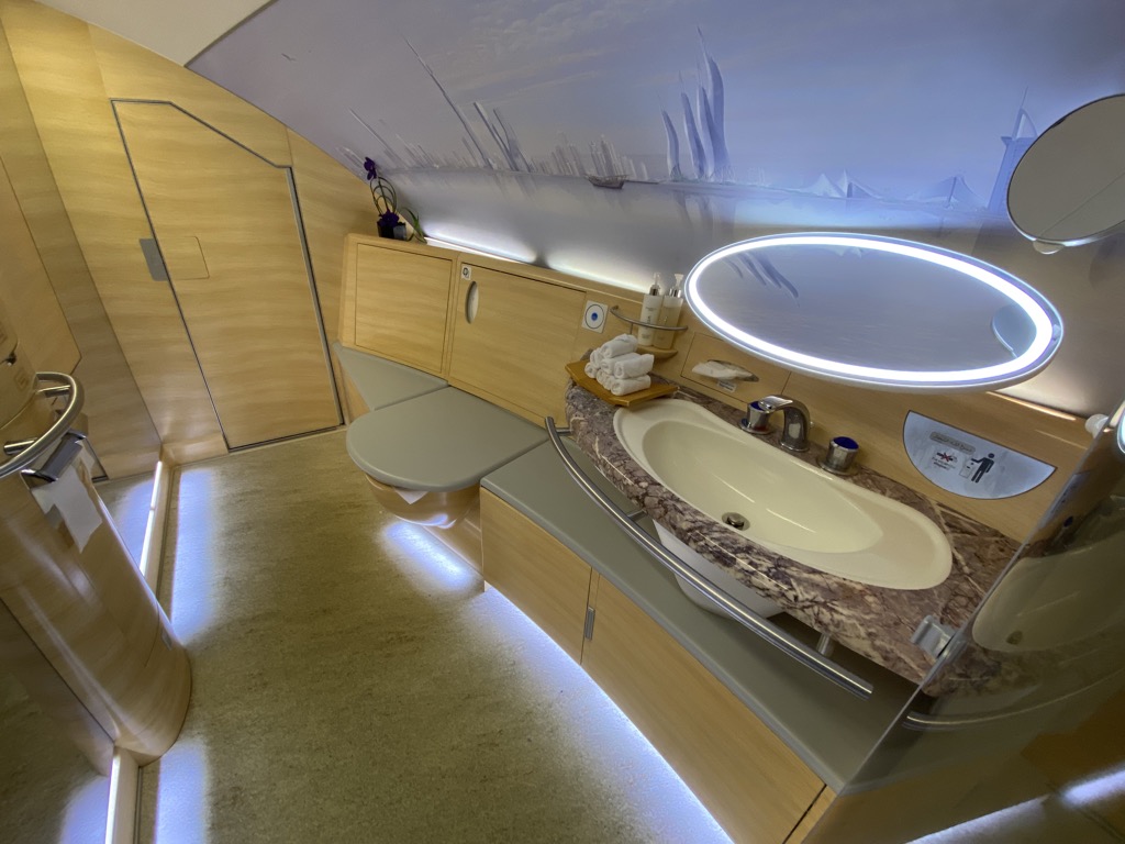 Am A380 gefallen uns besonders die verbauten „Shower-Spas“ – also Badezimmer inklusive Dusche. Hier haben wir noch vor dem Start die erste Veränderung nach den strengen Corona-Restriktionen entdeckt, denn es waren wieder Handtücher in Form einer Pyramide ausgelegt.