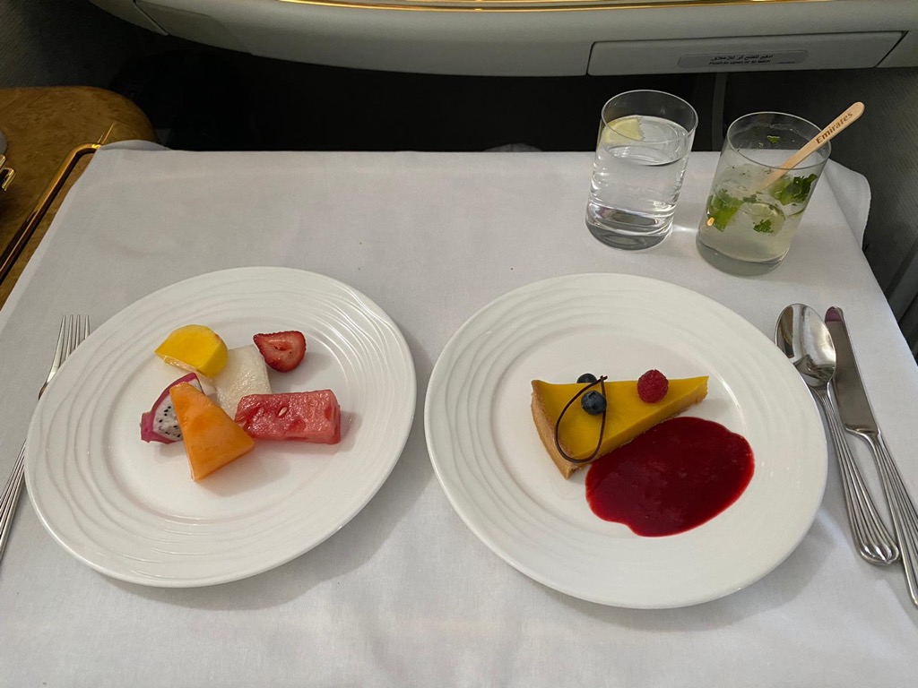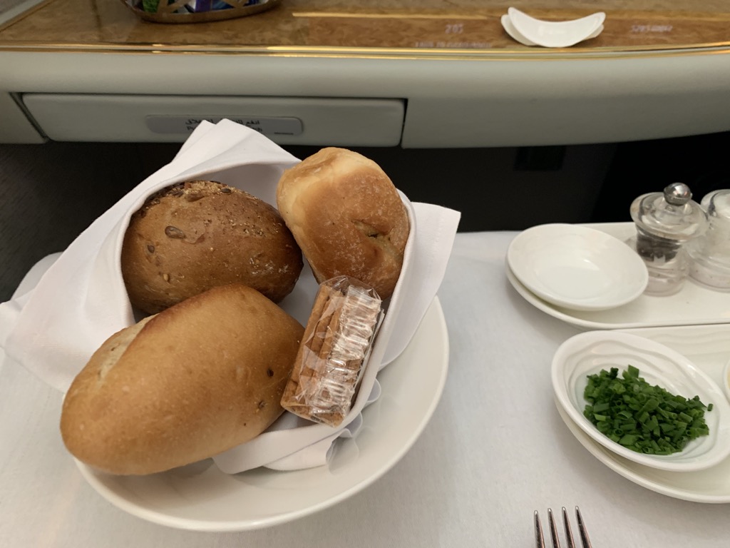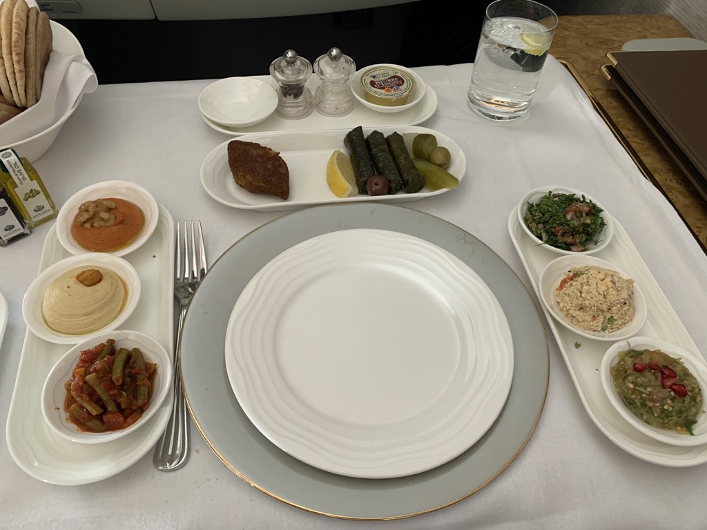 Da wir in der First Class Lounge am Boden noch etwas gegessen hatten, starteten wir nicht direkt nach dem Erreichen der Reisehöhe mit dem Essen und bestellten uns die Vorspeise auf etwa 90 Minuten nach Start. Das Dine on Demand Konzept von Emirates ist wirklich toll, schön dass dies immer mehr Airlines genau so handhaben.