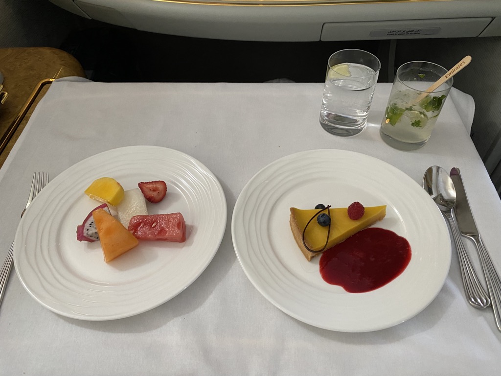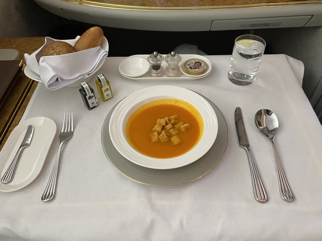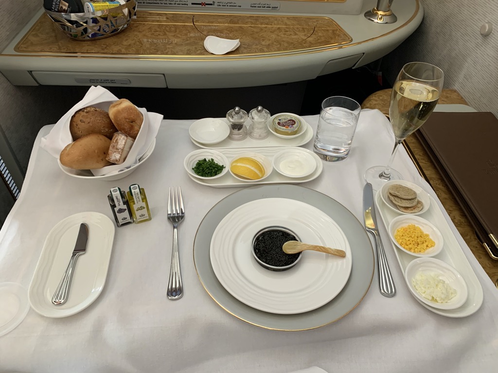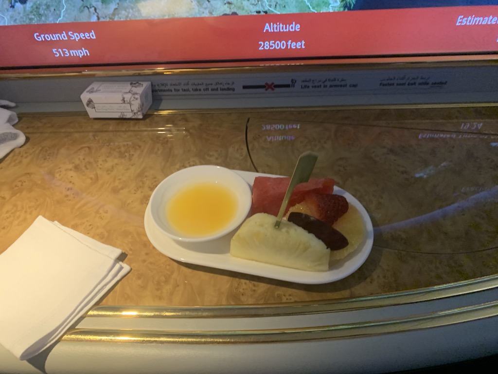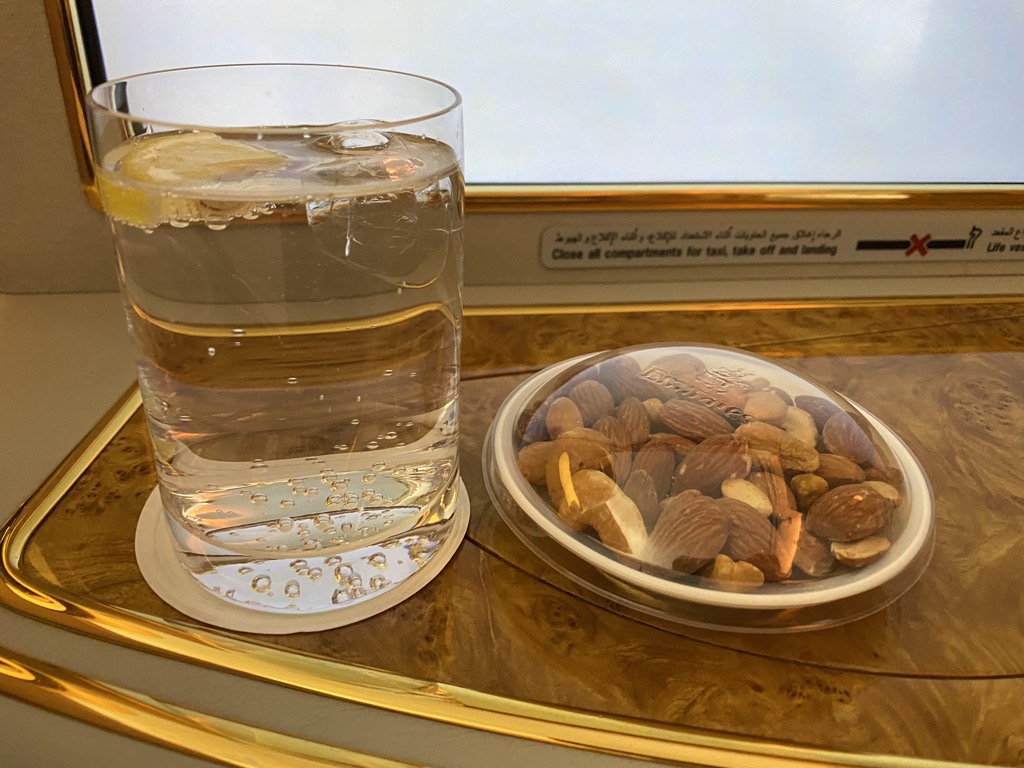 Da wir in der First Class Lounge am Boden noch etwas gegessen hatten, starteten wir nicht direkt nach dem Erreichen der Reisehöhe mit dem Essen und bestellten uns die Vorspeise auf etwa 90 Minuten nach Start. Das Dine on Demand Konzept von Emirates ist wirklich toll, schön dass dies immer mehr Airlines genau so handhaben.